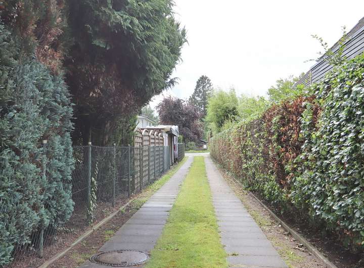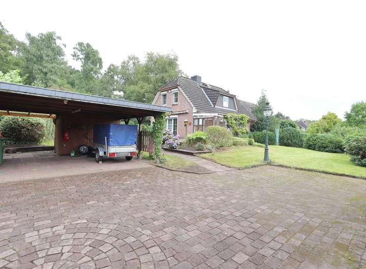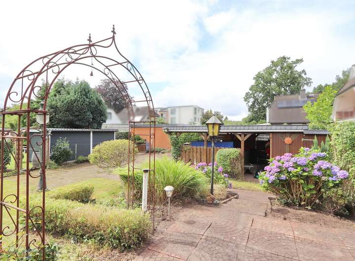 Der Außenbereich besticht durch einen eigenen Teich mit gemütlichen Sitzgelegenheiten, ein großes Doppelcarport und weitere Abstellmöglichkeiten. Im hinteren Bereich des Grundstücks befindet sich ein Zugang, dieser führt Sie direkt zum angrenzenden und malerischen Gehölz und Erlengraben.