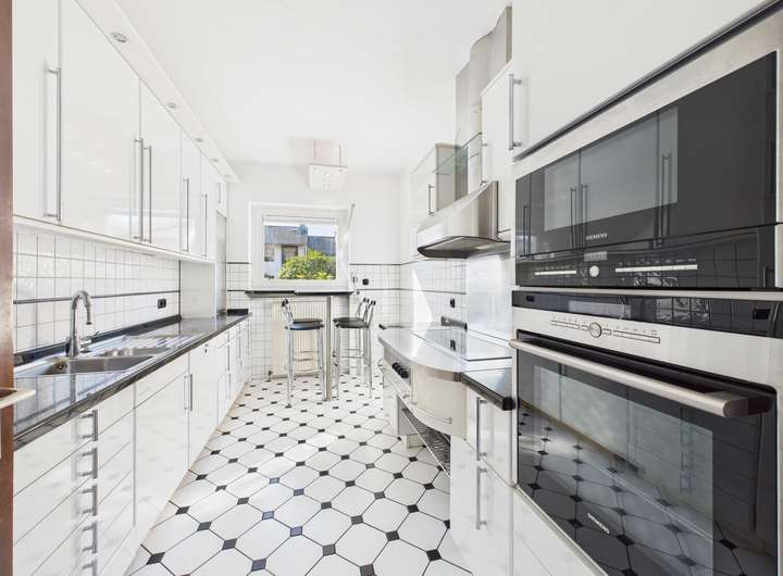 Die separate Küche ist mit einer Einbauküche ausgestattet und bietet ausreichend Arbeitsfläche sowie moderne Elektrogeräte. Das Erdgeschoss verfügt außerdem über ein geräumiges Schlafzimmer, ein Tageslichtbad und ein praktisches Ankleidezimmer.