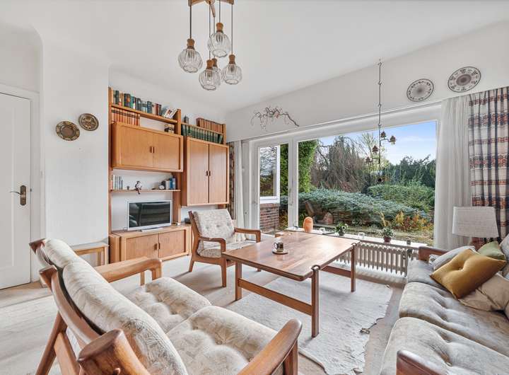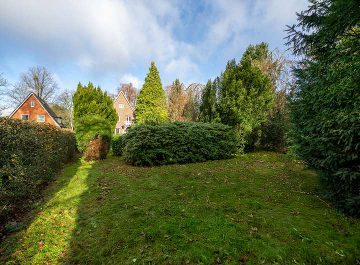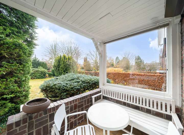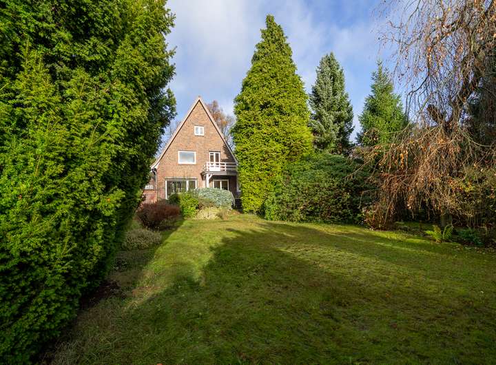 Das sonnige Süd-Grundstück verfügt über eine Größe von etwa 1.095 m². Pflegeleichter, liebevoll angelegter Garten mit Rasenflächen, alten Rhododendren und zahlreichen immergrünen Abpflanzungen.