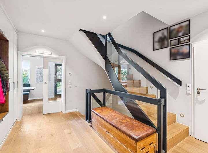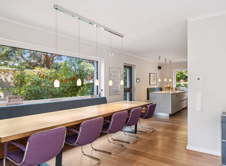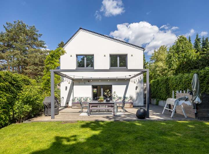 Dieses moderne und energieeffiziente KfW-Effizienzhaus 40 Haus wurde 2018 erbaut, kürzlich teilweise renoviert und ist sofort bezugsfertig. Auf ca. 183 m² wohnlicher Fläche sowie großzügiger Nutzfläche im Untergeschoss erwartet Sie höchster Wohnkomfort in familienfreundlicher Umgebung.Bereits beim Betreten überzeugt die großzügige Diele, die in den hellen, offen gestalteten Wohn-, Ess- und Kochbereich übergeht. Zur stilvollen Küche gehört ein dezent abgetrennter Vorratsbereich, der Ordnung und Übersicht wahrt. Hochwertige Miele-Einbaugeräte sowie ein Blue-Professional-System unterstreichen den hohen Anspruch. Ein zusätzlicher Seiteneingang, angrenzend an die Stellplätze bietet einen direkten Zugang in Küche und Wohnbereich. Große Fensterflächen öffnen den Blick in den sonnigen Süd-Garten mit Terrasse und Pergola, in dem Sie von morgens bis abends die Sonne genießen können. Ein Gäste-WC komplettiert das Raumangebot im Erdgeschoss. Im Obergeschoss erwarten Sie ein Elternschlafzimmer, zwei helle Kinderzimmer mit zusätzlicher Schlafebene – ein wahres Paradies für Kinder – sowie ein modernes Familienbad. Dank der bis unter das Dach reichenden Decke mit fast 4 Metern Raumhöhe vermittelt das Bad eine besondere Großzügigkeit. Das Untergeschoss präsentiert sich außergewöhnlich wohnlich und stilvoll: Große Fenster schaffen viel Tageslicht, ein Gäste- oder Arbeitszimmer, ein weiteres Duschbad sowie ein Technikraum mit allen Hausanschlüssen bieten flexible Nutzungsmöglichkeiten – ob für Gäste, Au-pair, Homeoffice oder Hobby. Technisch befindet sich das Haus auf höchstem Niveau: Luft-Wasser-Wärmepumpe, Fußbodenheizung auf allen Etagen, Wohnraumbelüftung, Entkalkungsanlage, Alarmanlage sowie eine Siedle-Videogegensprechanlage sorgen für Sicherheit, Komfort und Nachhaltigkeit (Energieklasse A+). Dreifachverglasung, elektrische Rollläden, Netzwerkverkabelung über alle Etagen und ein praktischer Wäscheschacht vom Bad in den Keller runden die moderne Ausstattung ab. Leerrohre für die Installation einer zukünftigen Photovoltaikanlage auf dem Dach sind bereits vorbereitet. Auch in puncto Parkmöglichkeiten ist bestens vorgesorgt: Zwei Stellplätze direkt vor der Tür verfügen über einen Ladeanschluss für Elektroautos. Zusätzlich sind derzeit fünf weitere Stellplätze vermietet. Ergänzend bietet ein hochwertiges Gartenhaus weitere Abstellfläche. Mit durchdachtem Grundriss, modernster Technik, einem sonnigen Garten und zahlreichen Annehmlichkeiten ist dieses Haus ideal für alle, die Komfort, Effizienz und stilvolles Wohnen schätzen.