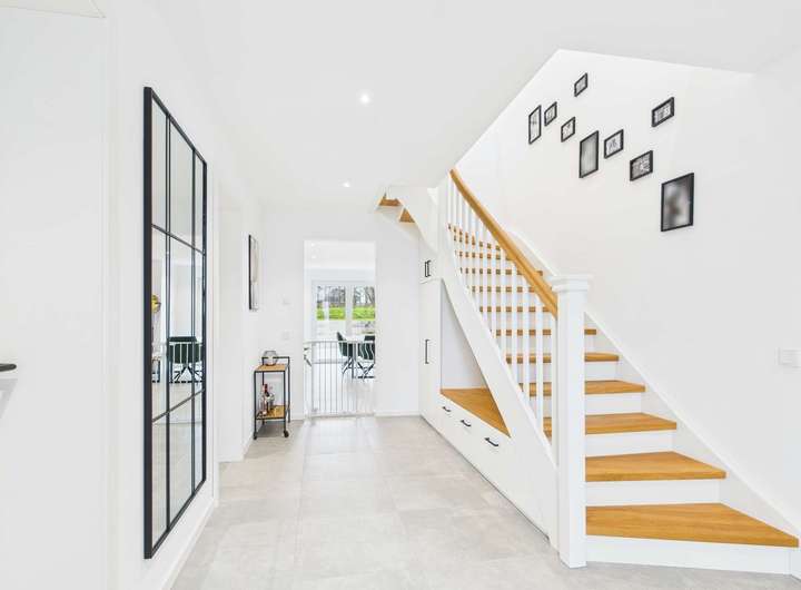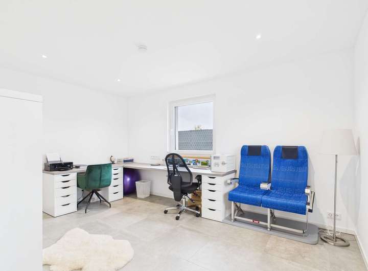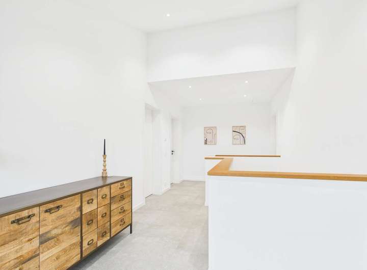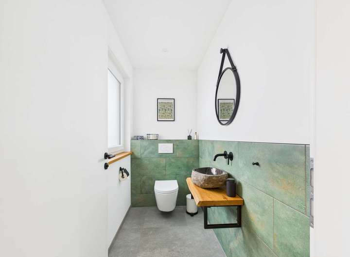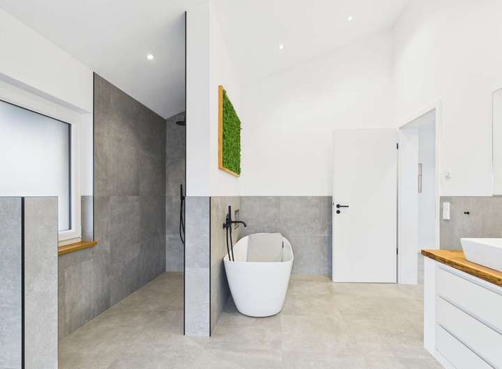 Im Erdgeschoss befindet sich ein stylisches Gäste-WC, eine zusätzliche Dusche ist sehr durchdacht im Hauswirtschaftsraum untergebracht. Im Obergeschoss beeindruckt das luxuriöse Traumbad: freistehende Badewanne, begehbare Dusche und hochwertige Ausstattung schaffen ein Spa-Gefühl im Alltag.