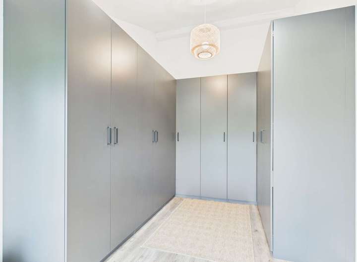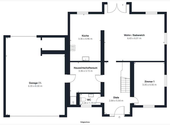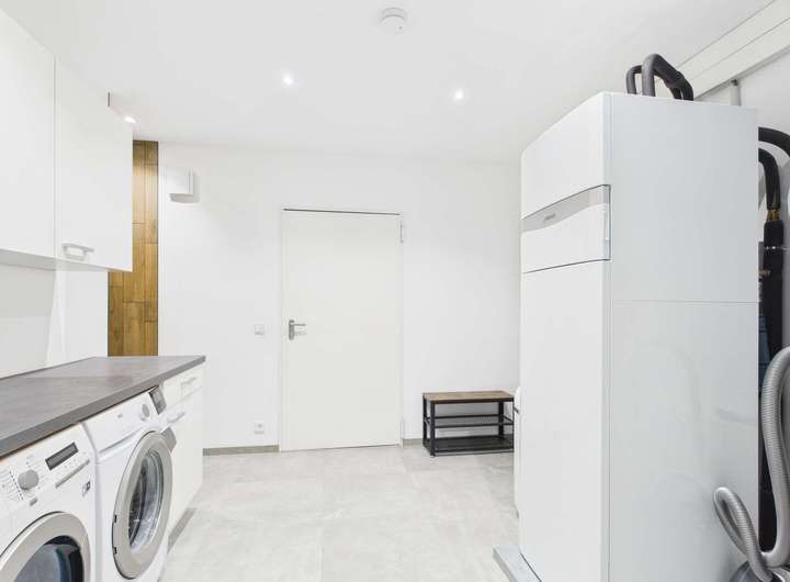 Ein Hauswirtschaftsraum mit Zugang zur geräumigen Doppelgarage sorgt für kurze Wege und durchdachte Funktionalität. Durch ein rückseitiges, zusätzliches Garagentor kann der Garten auch durch die Garage befahren werden. Unter der Treppe bieten maßgefertigte Einbauschränke vom Schreiner zusätzlichen Stauraum auf elegante Weise.