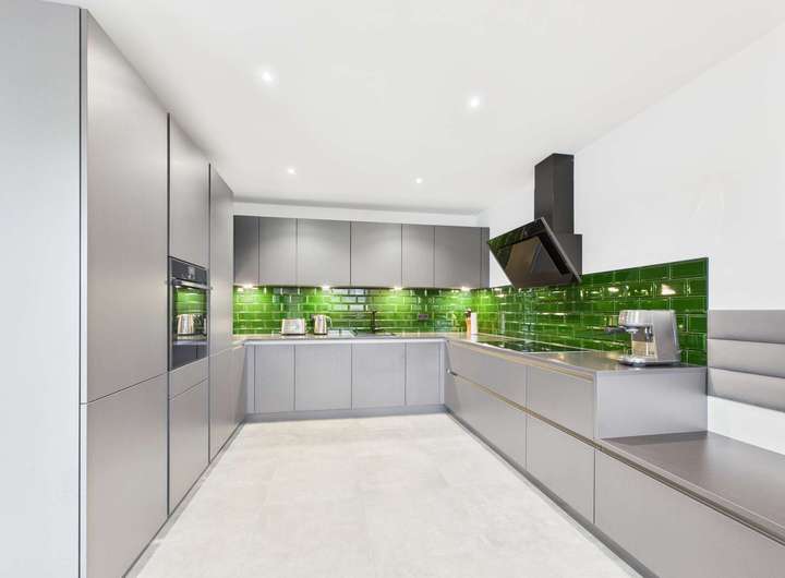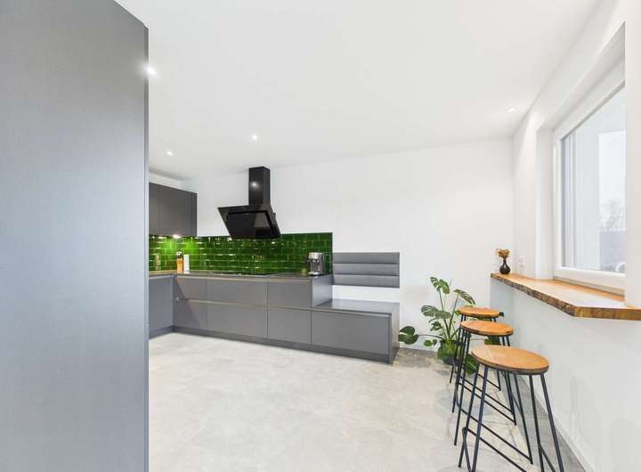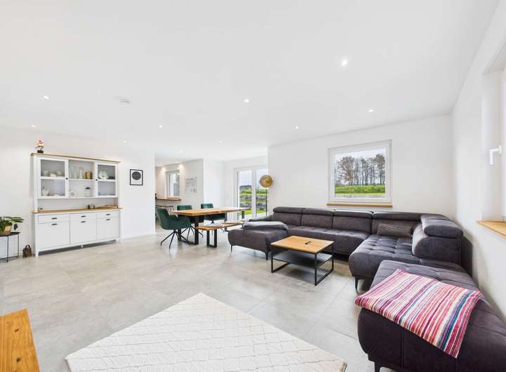 Der großzügige, lichtdurchflutete Wohn- und Essbereich mit angrenzender offener Küche bildet das Herzstück des Hauses. Große Fensterflächen eröffnen den Blick in die Natur, schaffen eine helle, einladende Atmosphäre und bieten Zugang zur traumhaft gelegenen Terrasse mit Südausrichtung. Die hochwertige Einbauküche überzeugt durch modernes Design und beste Ausstattung – perfekt für gemeinsame Kochabende und gesellige Stunden.