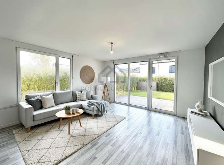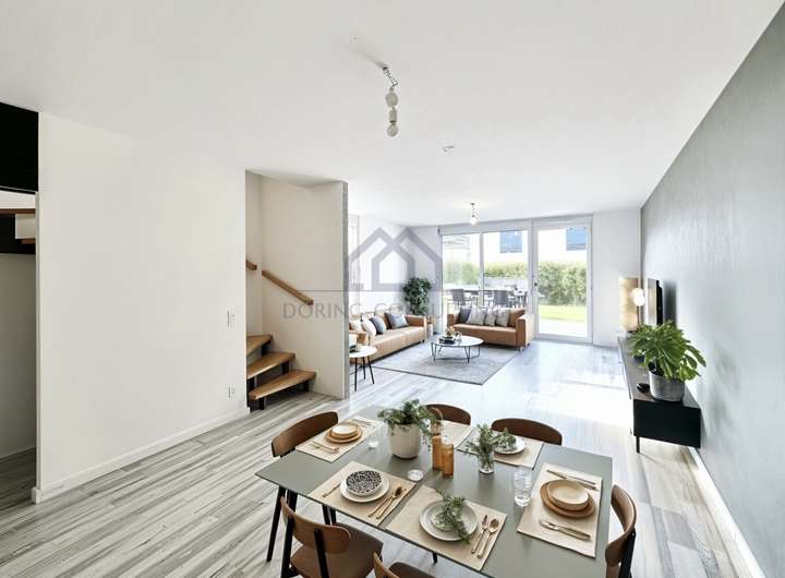 Bereits beim Betreten des Hauses gelangen Sie in einen hellen Eingangsbereich, der Sie freundlich empfängt. Direkt daneben befindet sich das Gäste-WC, modern ausgestattet und ideal für Besucher. Wohn - und Essbereich ist mit einem offenen Küchenbereich ausgestattet. Die Einbauküche ist mit allen notwendigen Elektrogeräten ausgestattet. Durch die bodentiefen Fenster wird der Wohn- und Essbereich mit ausreichend Licht durchflutet. Von hier aus gelangen Sie auf die kleine Terrasse mit Garten. Der Garten lädt zu sonnigen und entspannten Stunden ein.