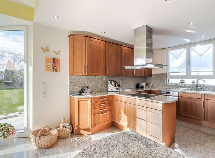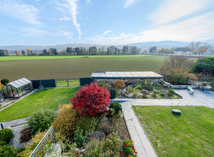 Den herrlichen Taunusblick genießen Sie von den beiden Gartenterrassen im Erdgeschoss und Souterrain, dem Balkon und der uneinsehbaren Dachloggia. Der schön angelegte Garten mit großer Rasenfläche beherbergt außerdem zwei Gartenhäuser (eines davon mit Gartenküche) sowie einen Pavillon. Der Rasenmähroboter und die 27.000-Liter-Zisterne unterstützen die Gartenpflege.