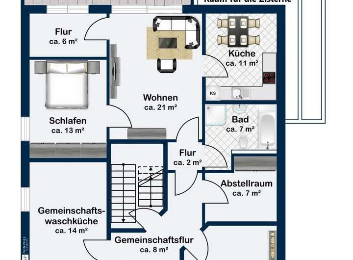 - ansonsten Fliesenboden in den übrigen Küchen, Bädern und Laminat in den Schlafbereichen