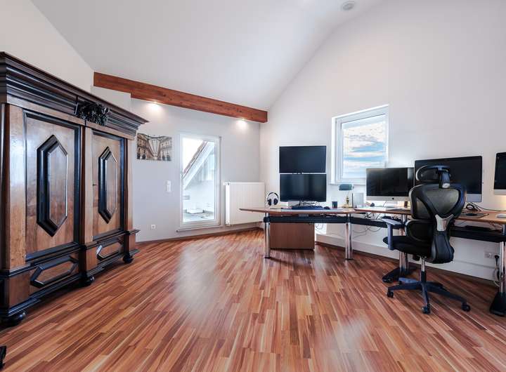 Das Gebäude verfügt über insgesamt 12 Zimmer auf 4 Etagen, wobei 7 geräumige Schlafzimmer flexible Wohn- und Nutzungsmöglichkeiten bieten – ideal für Mehrgenerationenwohnen, große Familien, Teilvermietung oder Wohnen und Arbeiten unter einem Dach. Ergänzt wird der Wohnraum durch fünf moderne Badezimmer und ein Gäste-WC im Erdgeschoss.