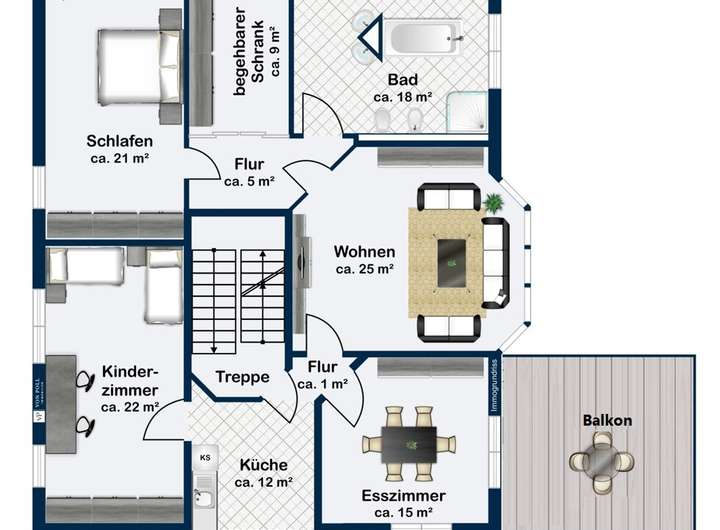 - Massivbauweise mit 17,5cm Kalksandstein zzgl. 14cm Außendämmung mit Mineralputz