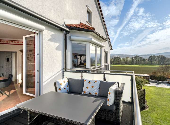 - neu errichteter großer Balkon im 1.OG mit Fernblick (inkl. elektr. Markise, WPC-Dielen, Edelstahl-Milchglas-Geländer)