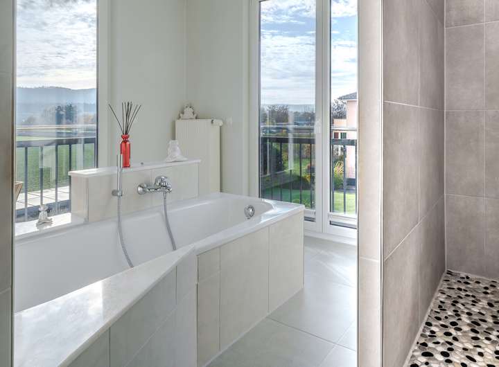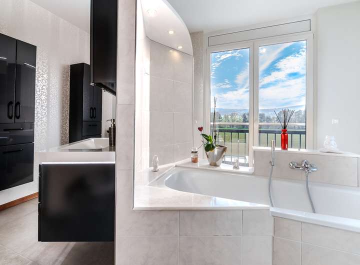 Eine Badewanne mit Feldbergblick? Kein Problem im außergewöhnlichen, rund 18m² großen und mit bodentiefen Fenstern versehenen Hauptbad im 1. Obergeschoss, das neben dem beeindruckenden Ausblick von der freistehenden Badewanne zusätzlich mit einer großen bodengleichen Dusche und zwei Waschtischen aufwartet.