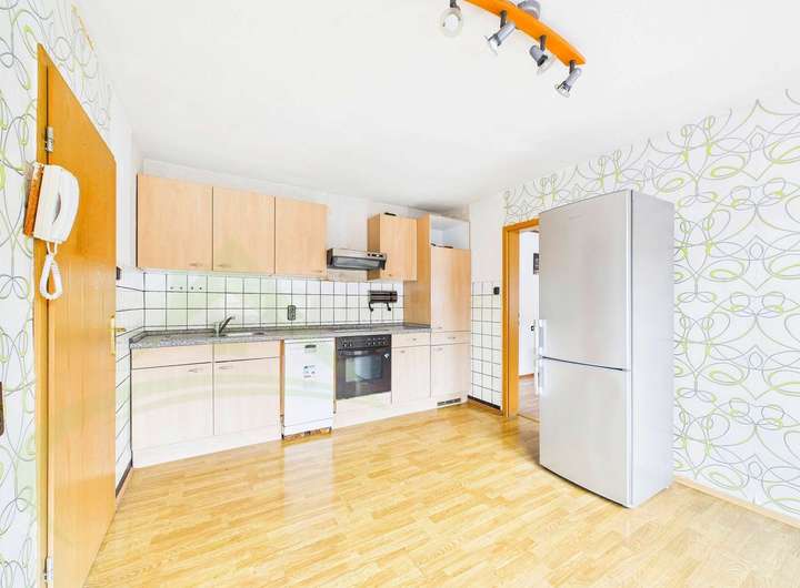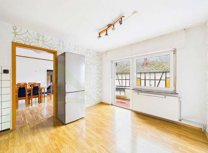 Die vorhandene Einbauküche bildet das funktionale Herzstück im Erdgeschoss. Dank der Vielzahl an Räumen lässt sich die Immobilie ganz individuell gestalten – sei es mit einem Homeoffice, Hobbyraum oder Spielzimmer.