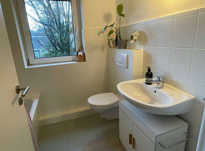 Im Obergeschoss liegen drei flexibel nutzbare Zimmer (ca. 7–15 m²). Die beiden größeren verfügen über neue Einbauschränke. Ein Tageslichtbad mit Badewanne und ein zentraler Flur vervollständigen das Geschoss.