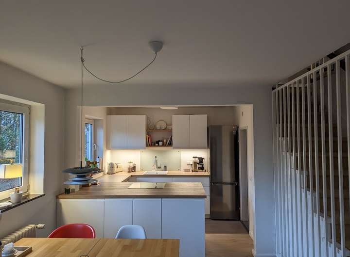 Im Erdgeschoss gelangt man über einen Windfang mit Gäste-WC in die 2020 modernisierte Wohnküche mit Wanddurchbruch und neuer Einbauküche samt Induktionsherd. Ein Abstellraum bietet Platz für Vorräte. Zusätzlich gibt es einen separaten Heizungsraum und einen großen Hauswirtschaftsraum.
