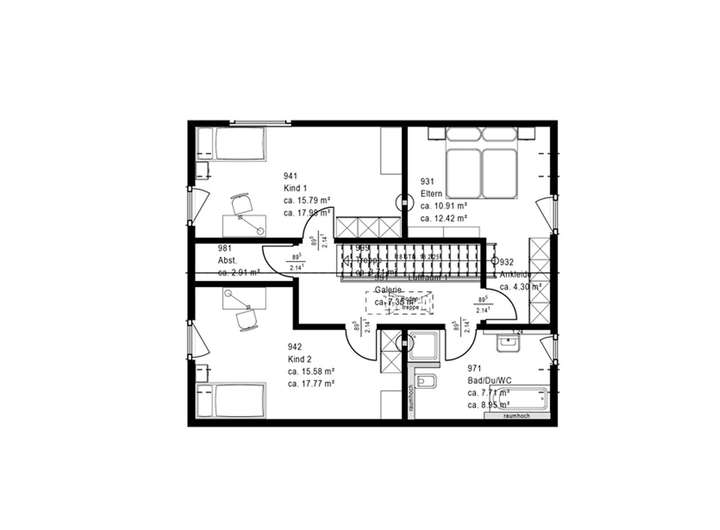 Eine gerade Treppe führt stilvoll in das Dachgeschoss mit Elternschlafzimmer und zwei gleich großen Kinderzimmern. Abgerundet wird das Raumangebot in der oberen Etage durch ein großzügiges Badezimmer mit Dusche, Wanne und WC sowie einen praktischen Abstellraum.