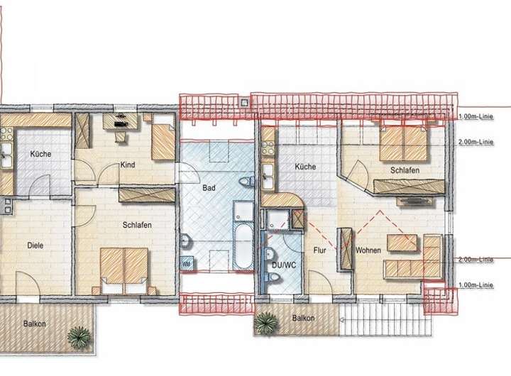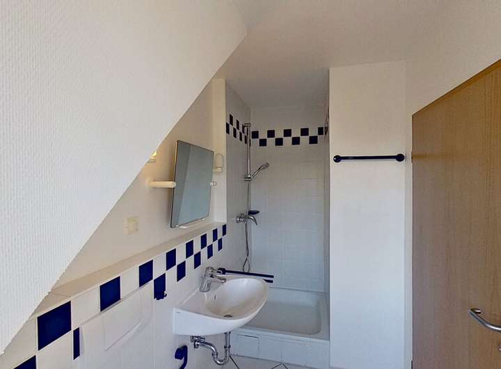 Wohnung 2 im Obergeschoss: Diese 3-Zimmer-Wohnung bietet auf ca. 97 m² ausreichend Platz für eine kleine Familie oder Paare. Sie verfügt über eine Küche, ein Badezimmer mit Badewanne und Dusche und einen Balkon.