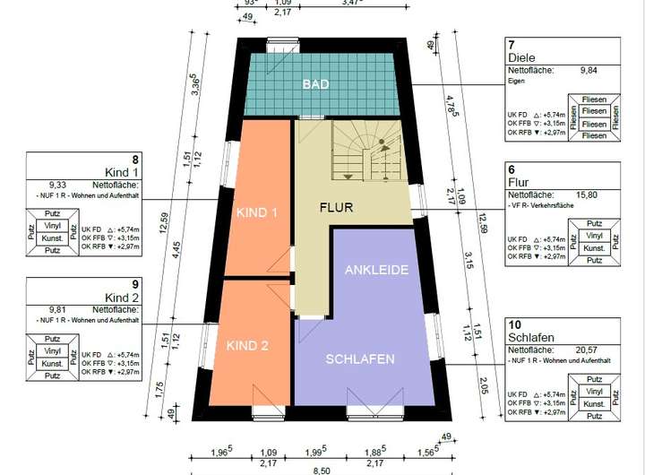 Im Obergeschoss erwarten Sie 2 annähernd gleich große Kinderzimmer, ein Masterbad mit bodengleicher Dusche + Badewanne + ein oder zwei Waschtische sowie eine Toilette. Hier können Sie sich entspannt zurückziehen und sich entspannen.