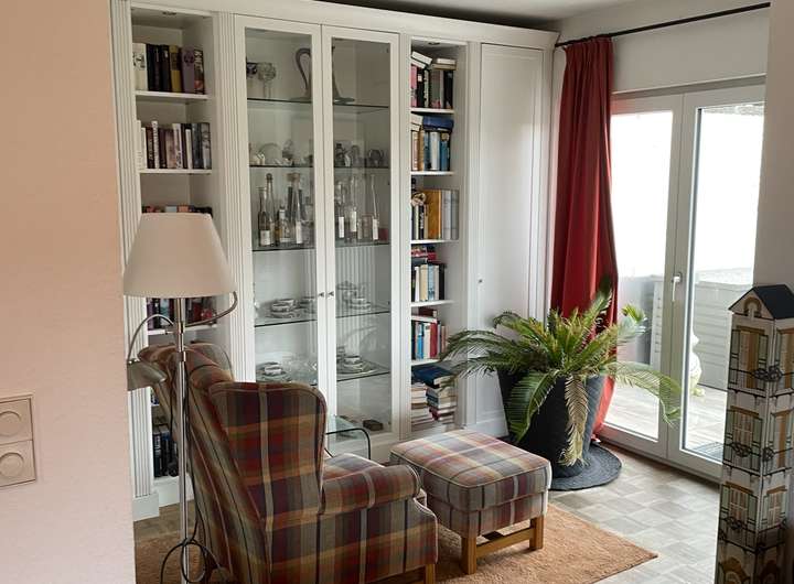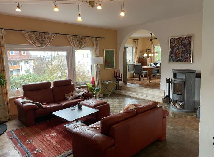 Im ersten Stock befindet sich der Wohn/Essbereich mit rd. 42 qm Wohnfläche. Hier befindet sich auch ein Kaminofen der in den Wintermonaten für eine schöne Stimmung und wohlige Wärme sorgt. Hieran anschließend die Küche, ein Abstellraum/Speisekammer, ein Gäste WC, der Zugang zum Balkon und dem Garten.