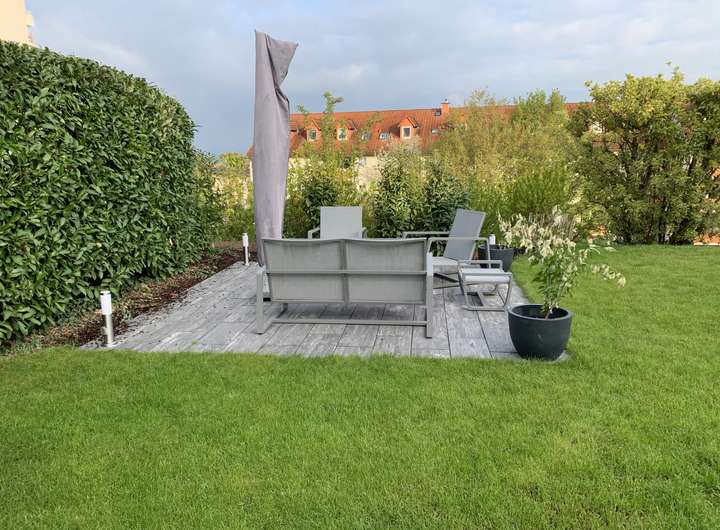 Das Grundstück ist schön eingewachsen. Ein Highlight ist der große Garten mit einer wunderschönen großen Südwest Terrasse zusätzlich gibt es eine zweite kleine Terrasse die als Lounge genutzt werden kann. Um den Garten pflegeleicht zu gestalten wurde sowohl in der Wiese als auch in den Blumenbeeten eine zeitgesteuerte Bewässerungsanlage installiert, auch übernimmt ein kleiner Rasenroboter die Rasenpflege. Als weiteres Gestaltungselement wurde ein Springbrunnen installiert.