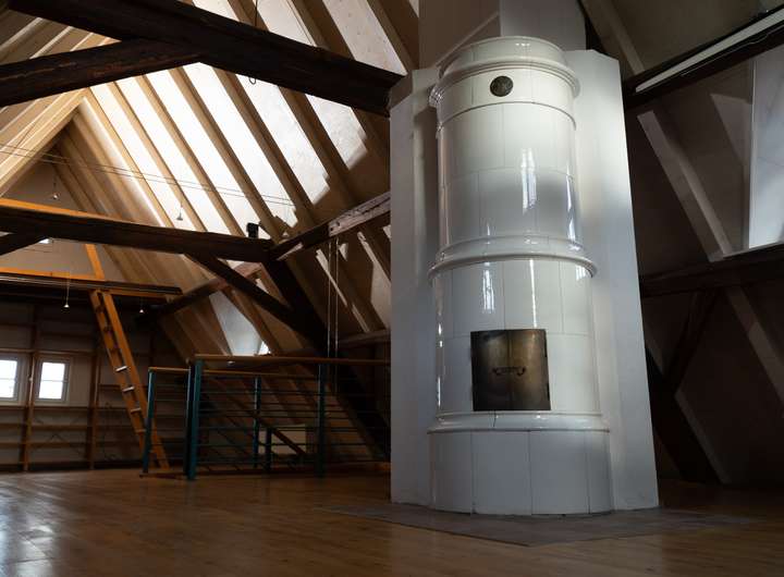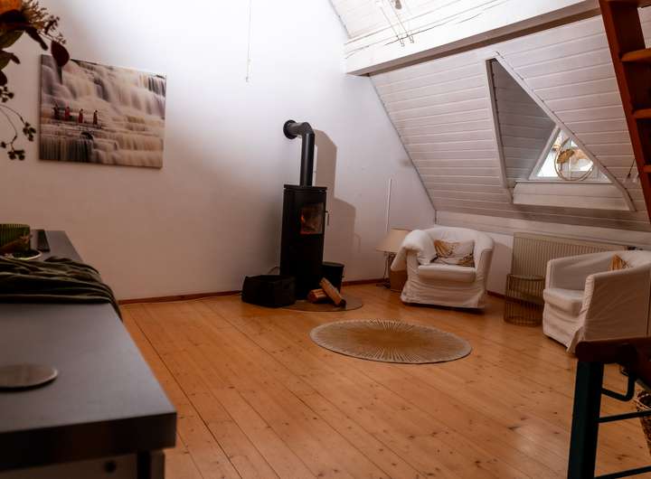Wohnbereich mit traditionellem Kachelofen – ein Ort der Ruhe und Wärme