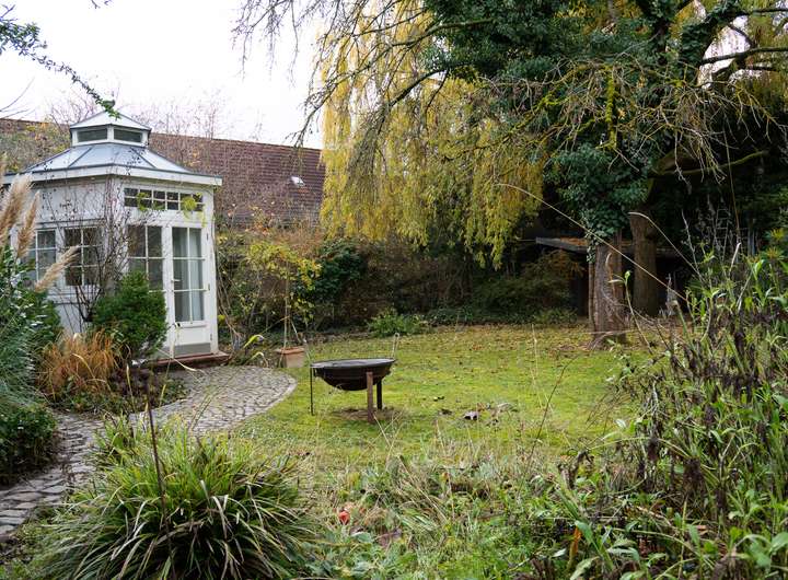 Das Anwesen öffnet sich zu einem atmosphärischen Innenhof und einem weitläufigen Garten im hinteren Grundstücksbereich.