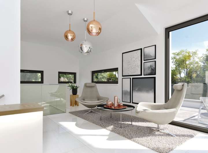 Das Musterhaus Mannheim bietet alles, was sich eine vierköpfige Familie nur wünschen kann: viel Platz für gemeinschaftliche Aktivitäten, gemütliche Rückzugsbereiche, ein gesundes Wohnumfeld sowie einen sehr geringen Energiebedarf. Die Basis des Konzepts bildet ein schlichter, quaderförmiger Baukörper, der Spielraum für eigene Ideen lässt. An das Musterhaus wurden beispielsweise zwei großzügig verglaste Erker mit Balkonen auf den Dächern angedockt. Die Fassade wurde teilweise mit hellen Fassadenplatten verkleidet, die dem Einfamilienhaus einen sehr frischen, modernen Touch verleihen. Den oberen Abschluss bildet ein flach geneigtes Satteldach mit weiten Dachüberständen, auf dem eine thermische Solaranlage installiert wurde. Entscheiden sich die Bauherren für eine Photovoltaikanlage, können sie aus ihrem Energiespar- sogar ein Plus-Energie-Haus machen. Der Eingangsbereich liegt zwischen den beiden Anbauten. Schon beim Betreten des Fertighauses wird man sich der luftigen Atmosphäre und des angenehmen Raumklimas bewusst. Eine helle, repräsentative Diele geleitet die Besucher in die verschiedenen Räumlichkeiten. Rechts, im kleineren Erker, liegt ein großes Büro, das fernab vom Familienleben konzentriertes Arbeiten ermöglicht. Nicht nur Selbstständige und Freiberufler werden die Ruhe zu schätzen wissen. Links der Diele befinden sich die lichtdurchfluteten Gemeinschaftsräume. Dank der raumhohen Verglasungen scheinen Innen- und Außenraum miteinander zu verschmelzen. So wird das Wohngeschehen begleitet vom spannenden Spiel der Jahreszeiten. Weiteres Highlight sind die in die Wand integrierten Regale, die für eine sehr einheitliche Optik sorgen. Neben dem Wohnzimmer wurde ein zweites Büro platziert. Es ist aber auch denkbar, hier ein zusätzliches Schlafzimmer oder auch einen schönen Spielbereich für den Nachwuchs einzurichten. Das Obergeschoss erreicht man nicht nur über eine stilvolle Treppe, sondern auch bequem über einen Aufzug. Oben werden die Besucher von einer lichtdurchfluteten Galerie empfangen, wo erst einmal eine gemütliche Sitzgruppe zum Verweilen einlädt. Zwei Kinderzimmer, ein Wellnessbad mit Sauna und der Masterbedroom mit zwei getrennten Ankleidebereichen lassen Wohnträume wahr werden.