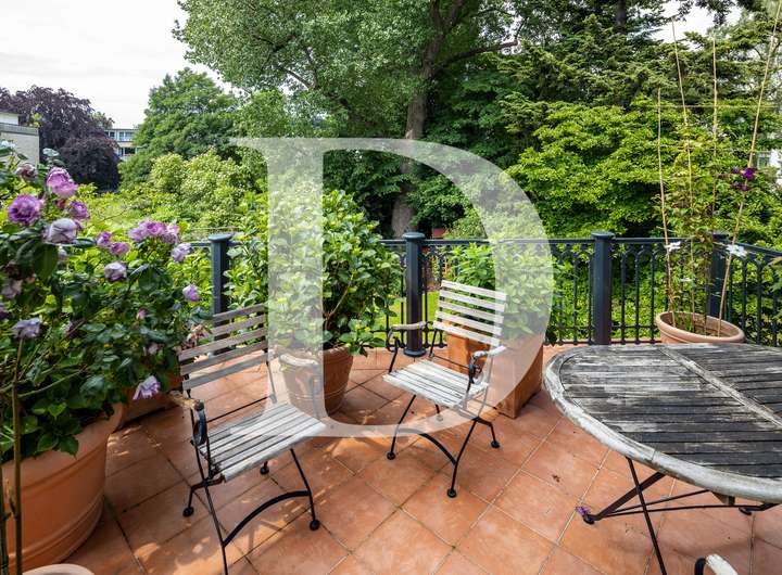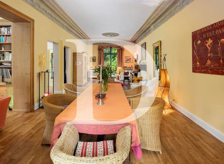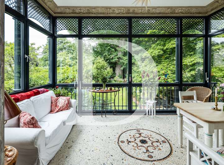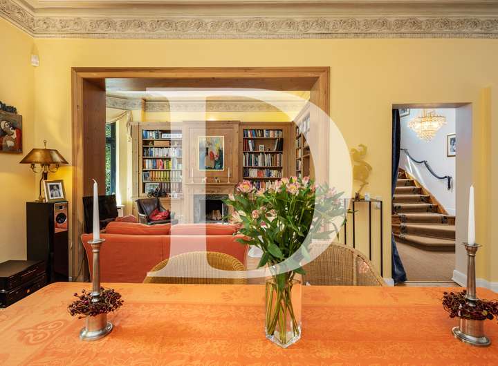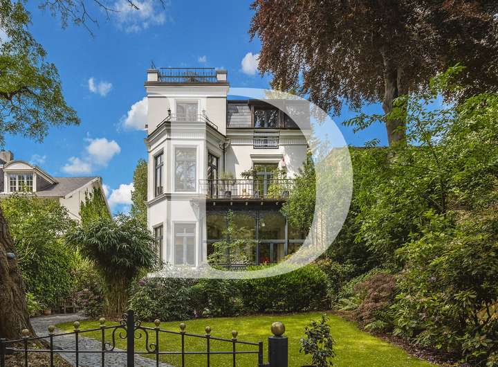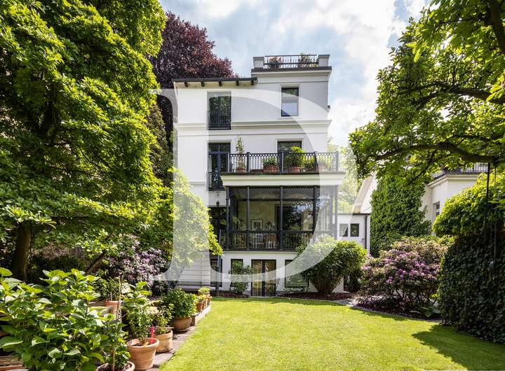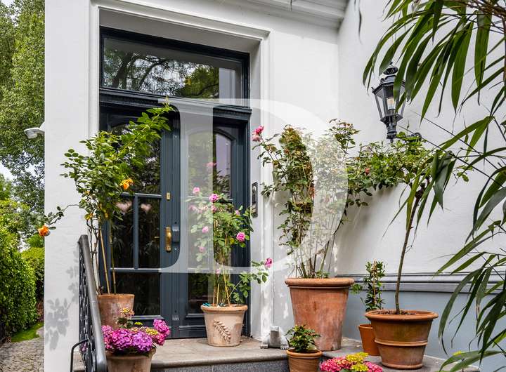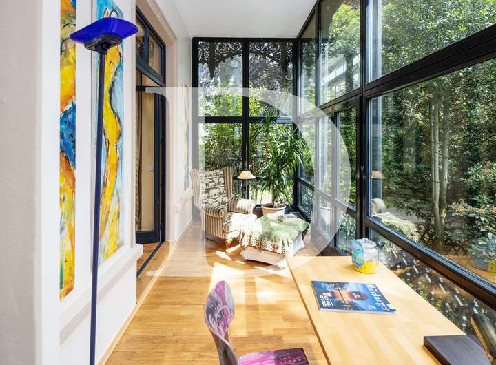 ca. 493 m² Wohnfläche , zwei Einliegerwohnungen mit ca. 62 m² und 39 m², historisches Treppenhaus mit Bleiverglasung, Hochparterre mit prächtigem Stuck, Holzfußböden, Marmorkamin und Einbauten aus Zirbelkiefer, L-förmiger Wohnbereich mit integriertem, aufwendig restauriertem, antiken Wintergarten, Küche mit maßangefertigten Einbauten und Zugang zu weiterem Wintergarten, italienischer Terrazzo-Boden in Küche und Wintergarten, erstes Obergeschoss mit drei Zimmern und Ankleide, Vollbad mit portugiesischem Marmor, Duschbad mit Naturstein, zweites Obergeschoss mit weiteren Zimmern, Gäste-WC sowie Voll-/Duschbad, ca. 50 m² Dachterrasse mit Weitblick, Bankirai-Bohlen 2020 erneuert, hohe Decken, Fußbodenheizung in Bädern und Wintergarten, Gäste-WC und kleiner Weinkeller im Gartengeschoss, Alarmanlage, 3-fach Verglasung mit Sicherheitsglas