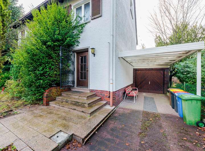 Der Außenbereich überzeugt mit einem großen Garten, einem nicht mehr genutzten Pool, einer großen Garage, einem Carport und weiteren Abstellmöglichkeiten.
