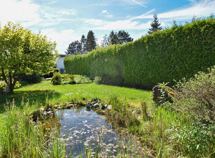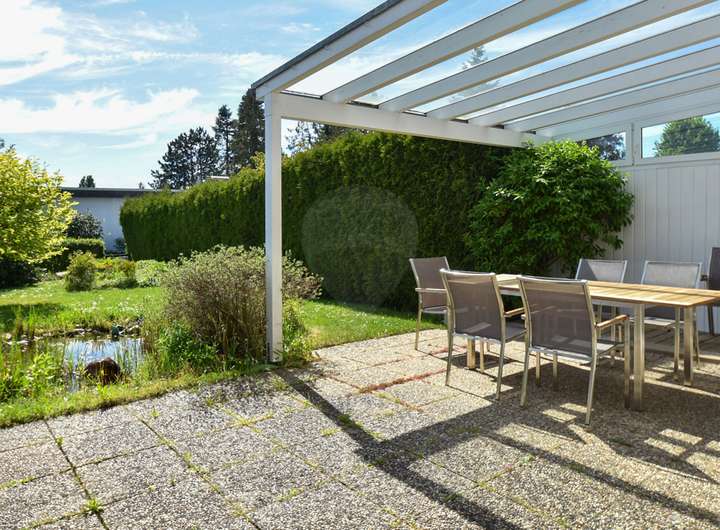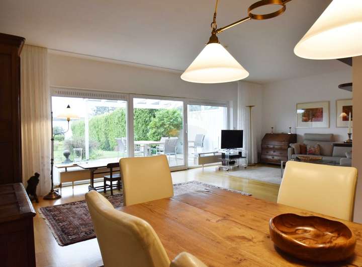 Der lichtdurchflutete, kombinierte Wohn-/Essbereich im Erdgeschoss schafft eine einladende Atmosphäre. Von hier aus haben Sie einen direkten Zugang zur teilweise überdachten großzügigen Terrasse und zum liebevoll angelegten und zum Teil uneinsehbaren großen Garten mit einem kleinen Teich.