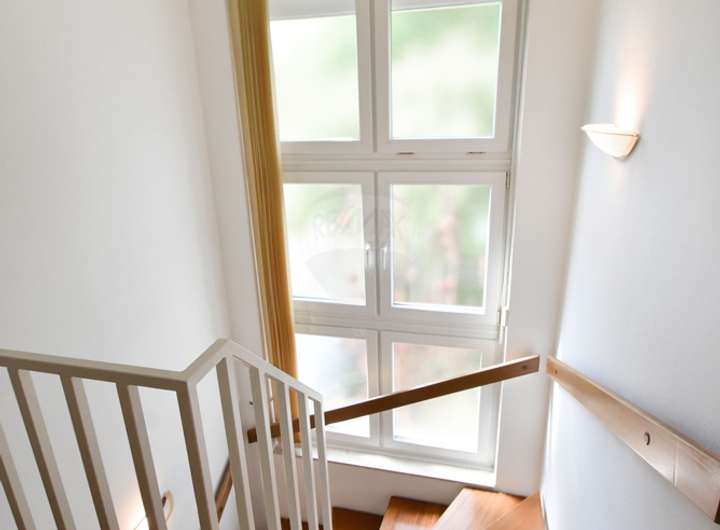 Große, 2-fach verglaste und teilweise bodentiefe Fenster mit Rollläden sorgen für lichtdurchflutete Räume. Beide Wohnetagen sind mit Echtholzparkett bzw. Fliesen ausgelegt.