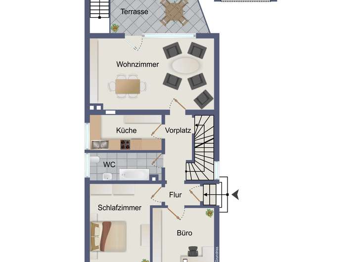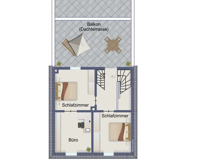 Zwei Schlafzimmer, Büro, Gäste-WC, große Dachterrasse