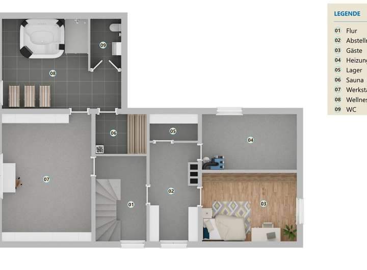Ein weiteres Highlight des Hauses ist der Wellnessbereich im Kellergeschoss mit Whirlpool und Sauna - Perfekt für eine Erholung im eigenen Zuhause. Zusätzlich finden Sie im Keller einen wohnlich ausgebauten Raum, der sich hervorragend als Gästezimmer eignet, sowie weitere Vorrats- und Abstellräume.