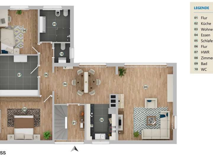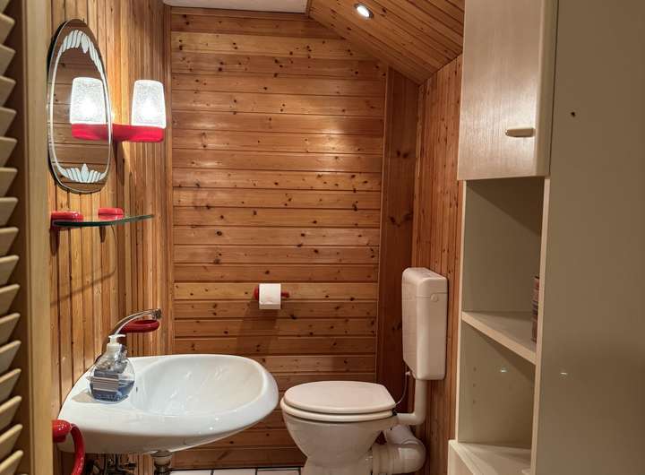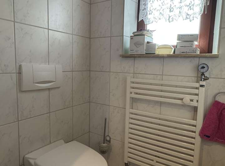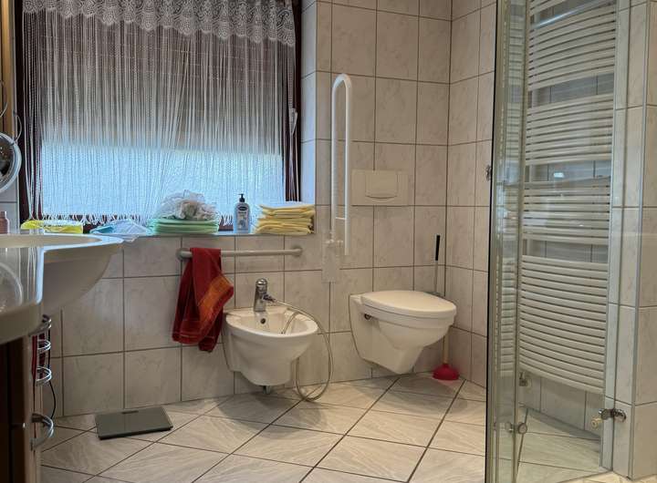 Zudem stehen Ihnen ein Gäste-WC und ein Badezimmer mit ebenerdiger Dusche sowie zwei Schlafzimmer zur Verfügung. Ein weiteres Zimmer wurde als Hauswirtschaftsraum mit Waschmaschinenanschluss ausgebaut.