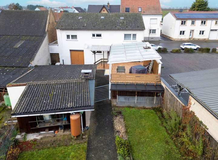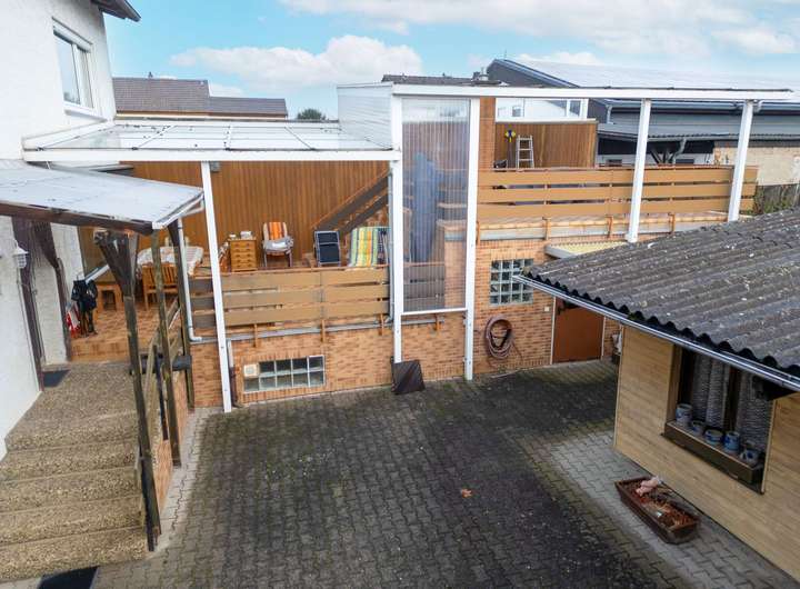 Ein echtes Highlight sind die Außenbereiche: Zwei große, überdachte Terrassen mit insgesamt ca. 50 m² bieten geschützte Wohlfühlzonen für entspannte Stunden im Freien – perfekt für Familienfeiern, Grillabende oder einfach zum Abschalten. Der charmante Innenhof schafft zusätzliche Privatsphäre, während mehrere Nebengebäude praktischen Raum für Werkstatt, Lager, Technik und den Zugang zum Gewölbekeller bieten.