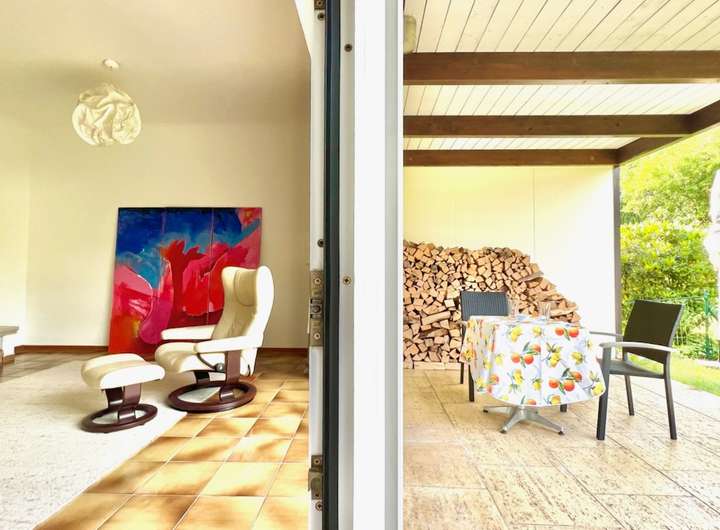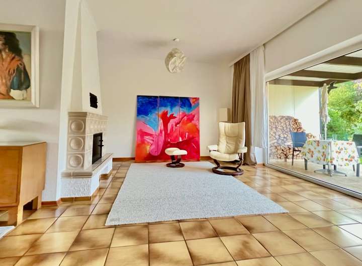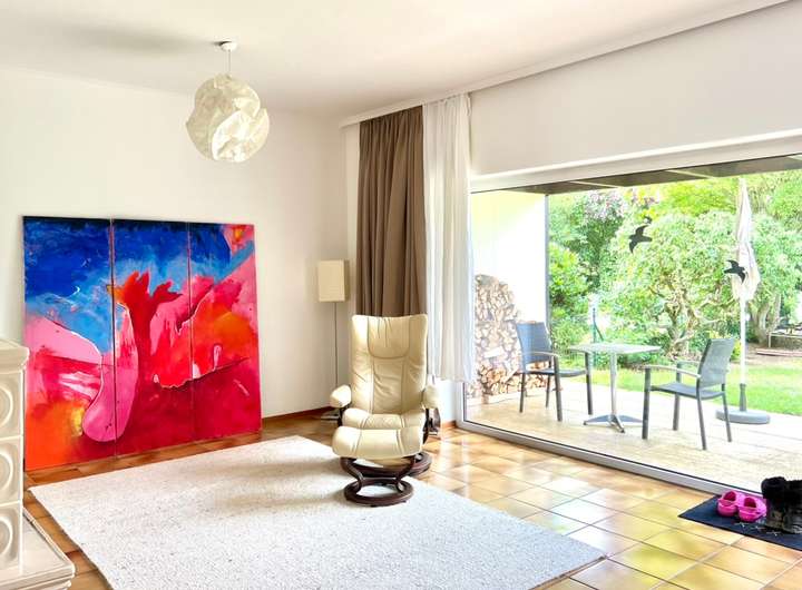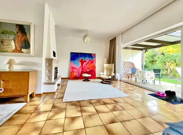 - optisch abgesetzer Wohnbereich mit Kamin und Zugang zur Terrasse sowie dem schön angelegten Garten
