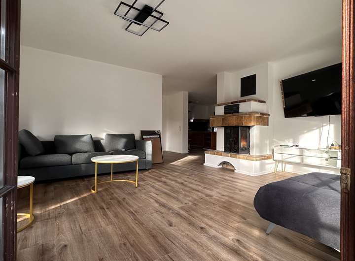 Im Erdgeschoss erwarten Sie ein geräumiges Wohn- und Esszimmer mit gemütlichem Kachelofen und Zugang zur erneuerten Terrasse sowie eine offene Küche mit Blick ins Grüne. Die bodentiefen Fensterflächen und Terrassentüren lassen viel Licht herein und öffnen den Wohn-Essbereich harmonisch zur Natur.