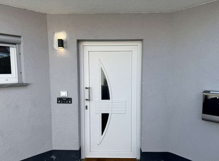 Weiße, isolierverglaste Kunststofffenster und Türen in hellem Holz-Ton verstärken den positiven Gesamteindruck.