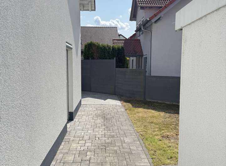 Mit wenigen Schritte erreichen Sie entweder über die gepflasterte Zuwegung von der Straße, begleitet von Büschen