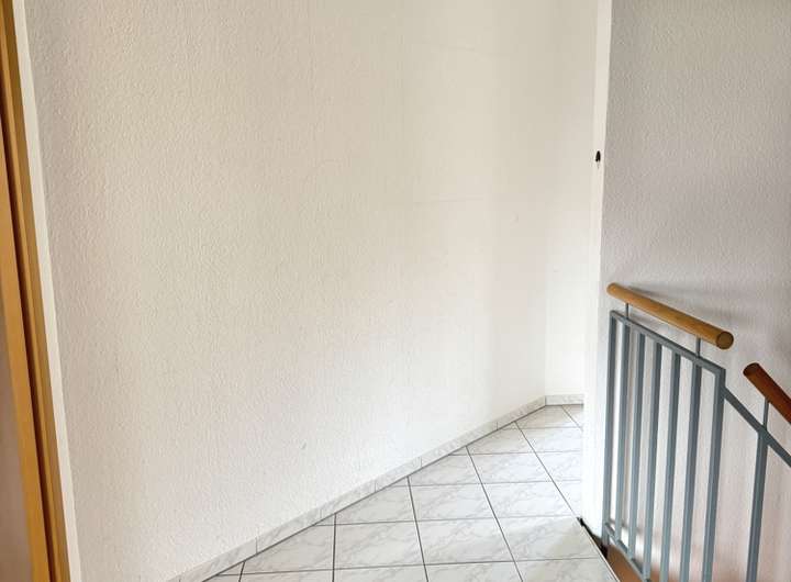 Im Obergeschoss besteht der Bodenbelag im Flur aus grau-weiß marmorierten Fliesen.