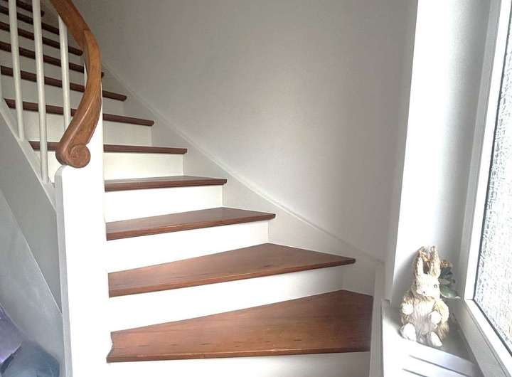 Über eine gepflegte Holztreppe gelangt man ins OG. Hier befinden sich drei unterschiedlich große Schlaf-/Kinderzimmer und ein modernes, helles Tageslicht-Vollbad mit Doppelwaschbecken, Badewanne und Fenster.