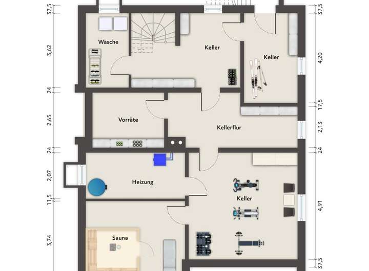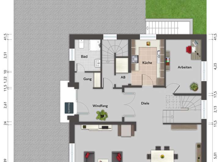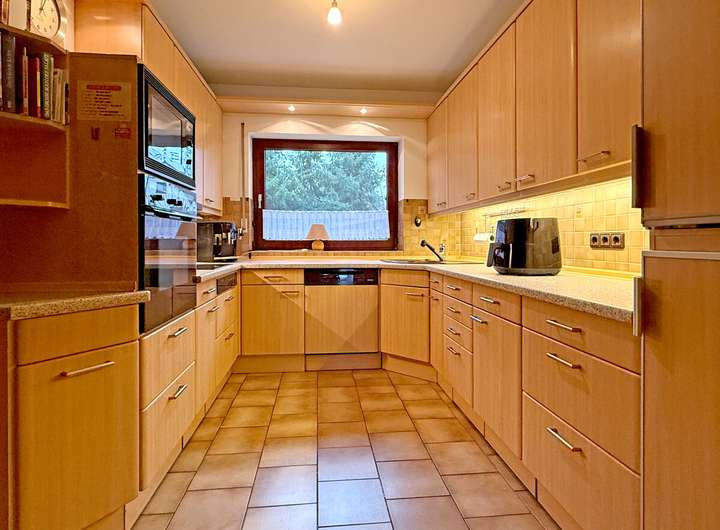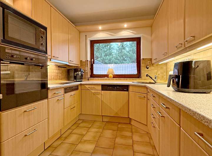 Die gut ausgestattete Küche besticht durch ihre funktionale Anordnung und bietet ausreichend Platz für kulinarische Kreationen. Angrenzend befindet sich ein praktischer Hauswirtschaftsraum, der zusätzlichen Stauraum bietet.