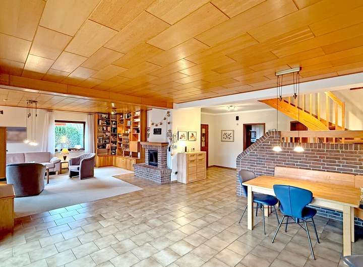 Beim Betreten des Hauses empfängt Sie ein einladender Eingangsbereich, der nahtlos in den großzügigen Wohnbereich übergeht. Die großen Fensterfronten lassen viel Tageslicht herein und schaffen eine helle, freundliche Atmosphäre. Der offene Wohn- und Essbereich mit seinem stilvollen Kamin lädt zu gemütlichen Abenden im Kreise der Familie ein.