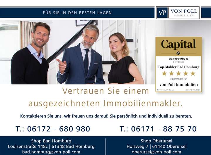 Bad Homburg liegt landschaftlich attraktiv und reizvoll am Fuße des Taunus und gehört zweifelsfrei zu den beliebtesten und gesuchtesten Taunusgemeinden. Von hier aus bieten sich viele Möglichkeiten, das Naherholungsgebiet „Taunus“ individuell zu nutzen. Radwanderwege, herrliche Waldlandschaften und romantische Pfade zur Saalburg und zum Herzberg laden zu Erholung und Sport ein. Die berühmte Kurstadt Bad Homburg bietet seinen Bewohnern eine ausgesprochen hohe Lebensqualität. Kur-/Thermal- und Wellnessbäder, Sport– und Freizeitmöglichkeiten, ein großes kulturelles Angebot sowie ausgezeichnete Restaurants und renommierte Schulen sind präsent. Das Kurhaus mit verschiedensten Veranstaltungen, die bekannte Spielbank, die Tennisplätze mit Clubanlage, sowie ein 9– und 16-Loch-Golfplatz stellen weitere Freizeitmöglichkeiten dar.