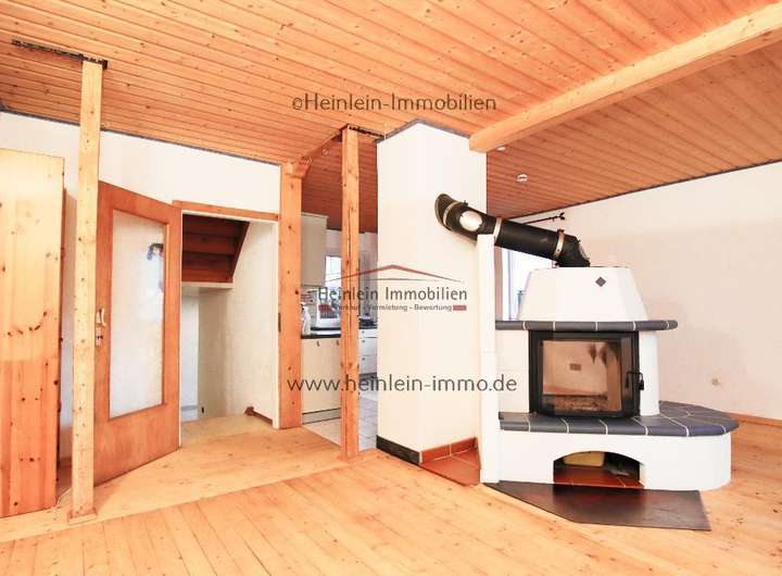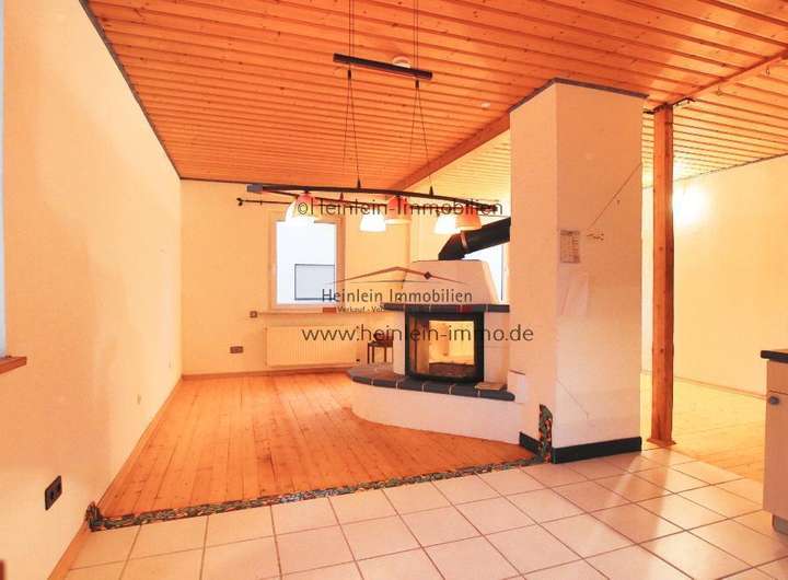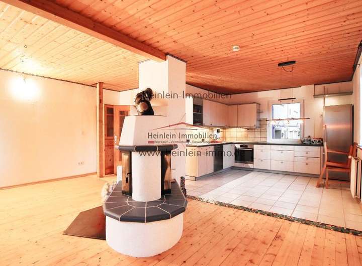 Zurück zum Eingangsflur, nun links über die Holztreppe eine halbe Etage höher, so befindet man sich im Wohnzimmer mit offener Küche. Der Blickfang ist ein Kaminofen mit beidseitigem Sichtfenster - der Raum ist ideal zur Kommunikation mit Gästen und der Familie.