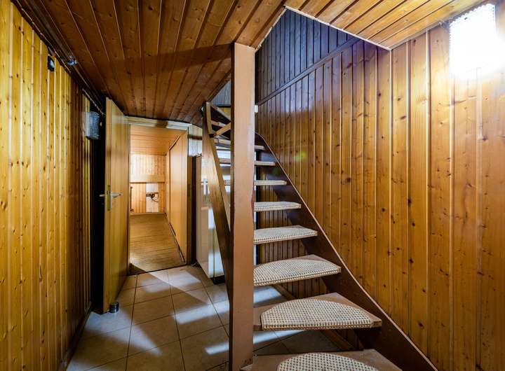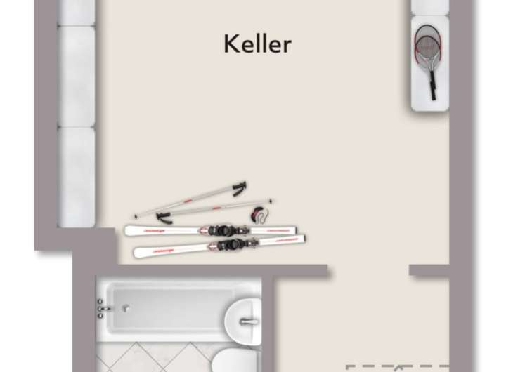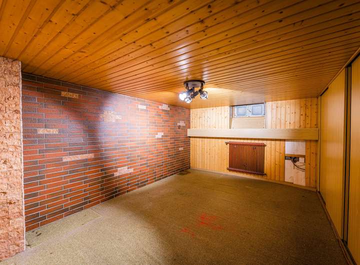 Der massiv gebaute Keller, typisch für die Ernst-May-Häuser, bietet neben großzügigem Stauraum auch ein zusätzliches Badezimmer mit Badewanne.