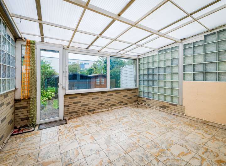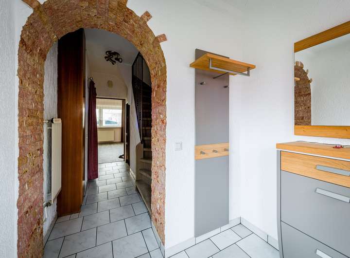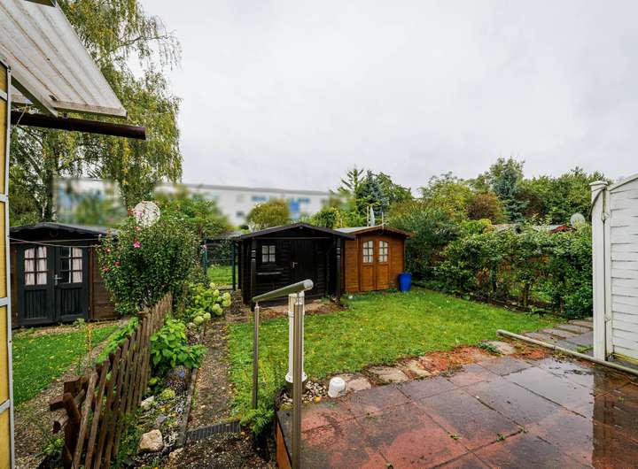 Im Erdgeschoss erwartet Sie ein einladender Eingangsbereich mit Platz für eine Garderobe. Die moderne Einbauküche ist funktional ausgestattet und erfüllt alle Anforderungen an den Alltag. Das großzügige, lichtdurchflutete Wohnzimmer geht fließend in den beheizten Wintergarten über, der den Wohnraum erweitert und ganzjährig nutzbar ist. Von hier aus betreten Sie den gepflegten Garten, der mit einer Gartenhütte praktischen Stauraum bietet.
