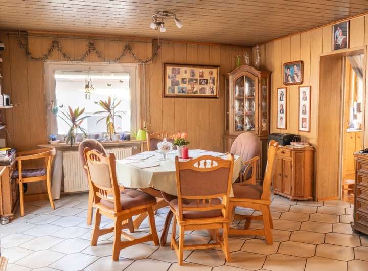 Im Erdgeschoss empfängt Sie ein heller Flur. Ein ehemaliger Friseursalon bietet sich heute als Büro, Gästezimmer oder Kinderreich an. Das Tageslichtbad ist funktional und bereit für frischen Glanz. Die geräumige Wohnküche mit Kochinsel ist das kommunikative Zentrum des Hauses – Kochen, reden, lachen, leben. Das anschließende Wohn- und Esszimmer bietet viel Platz für gemütliche Familienabende.