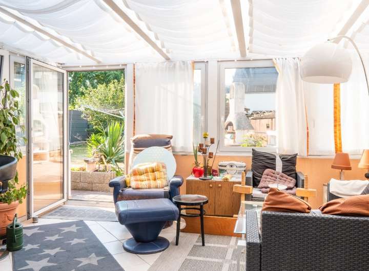 Highlight: der beheizte Wintergarten – lichtdurchflutet, ruhig, mit traumhaftem Blick in den Garten. Ein Ort zum Entspannen, Lesen, Ankommen. Oben warten zwei gemütliche Schlafzimmer – perfekt für Eltern, Kinder oder Gäste.
