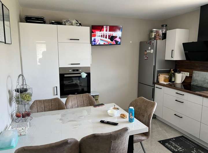 Die Wohnung im Erdgeschoss verfügt über etwa 76 m² Wohnfläche, bestehend aus einer Küche, einem Wohnzimmer, einem Schlafzimmer sowie einem Kinderzimmer mit direktem Zugang zur Terrasse. Ein Tageslichtbad mit Dusche ergänzt das Raumangebot.