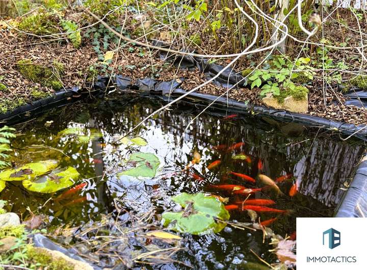 Das ca. 437 m² große Grundstück ist pflegeleicht angelegt und bietet alles, was man für entspannte Stunden im Freien braucht: eine über den Wintergarten erreichbare Terrasse, ein kleiner Fischteich, ein Gartenhaus und viel Platz zum Genießen. Eine große Garage sowie zwei zusätzliche Stellplätze sorgen für ausreichende Parkmöglichkeiten direkt am Haus.