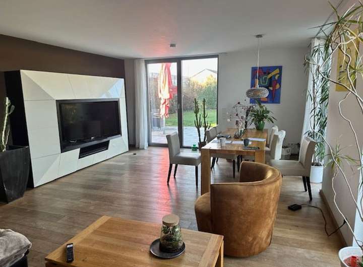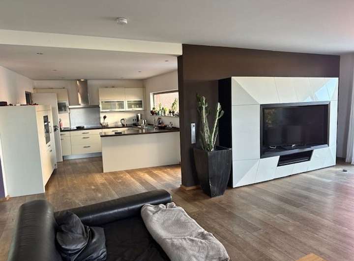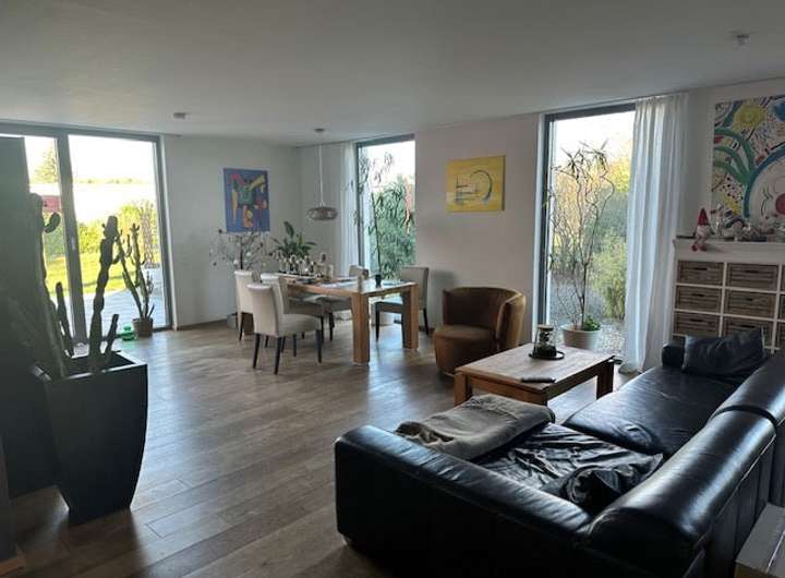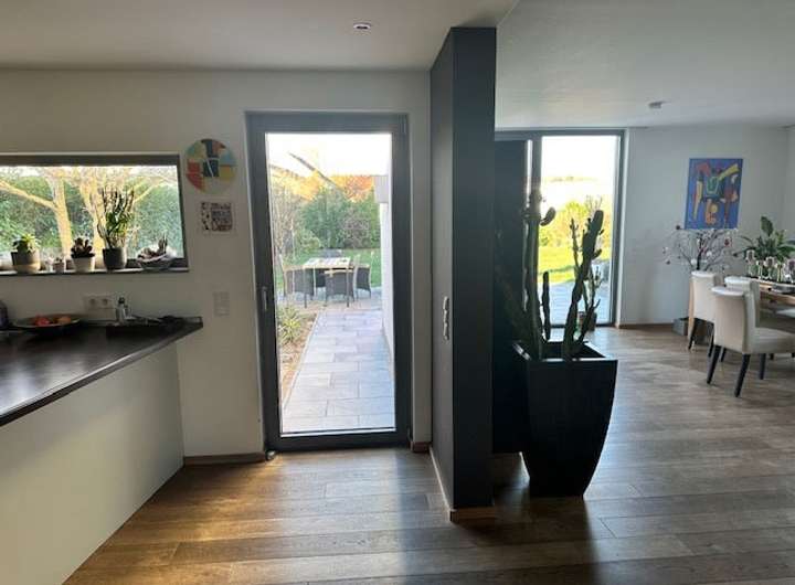 Die moderne Architektur überzeugt durch einen offenen großzügigen Grundriss sowie durch die großflächigen teilweise deckenhohe Alu-Fenster.